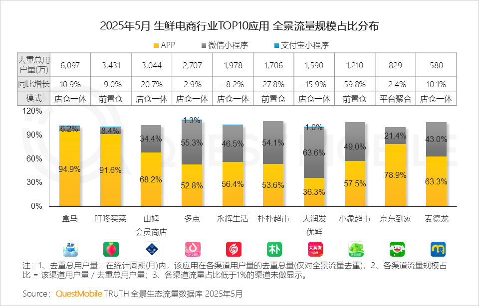 尽管挑战重重,叮咚买菜依然是生鲜电商赛道中不可忽视的头部力量。QuestMobile数据显示,2025年5月其在生鲜电商领域前10的市场份额保持在15%左右,与盒马同为市场的领先者。