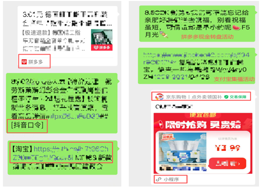结果发现,淘宝和抖音的分享都是口令或网页链接说明的形式至微信中,需要另外复制粘贴去该指定App中去打开,而京东、拼多多却不受任何影响,除了拼多多类似“砍一刀”的现金大转盘活动链接外。