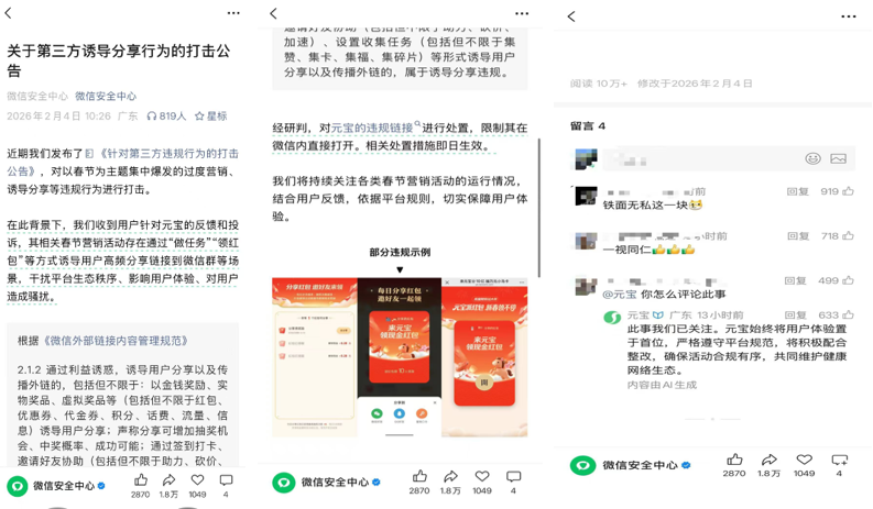 面对日益增长的质疑声,腾讯也陷入两难境地,一边是自家重点推广的春节红包活动,另一边是平台长期维护的规则体系,而没过多久这场“风波”,由微信亲手终结了,令人想不到的是,规则竟然占了上风。