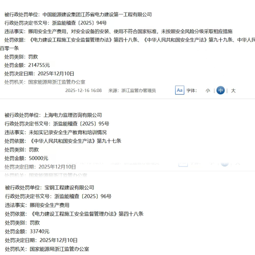 “挪用安全生产费用”——在国家能源局浙江监管办公室近期发布的行政处罚决定书中,这行字格外刺眼。宝钢工程建设有限公司因此被罚款33740元。而在同一批处罚名单中,上海电力监理咨询有限公司因“未如实记录安全生产教育和培训情况”被罚5万元。
