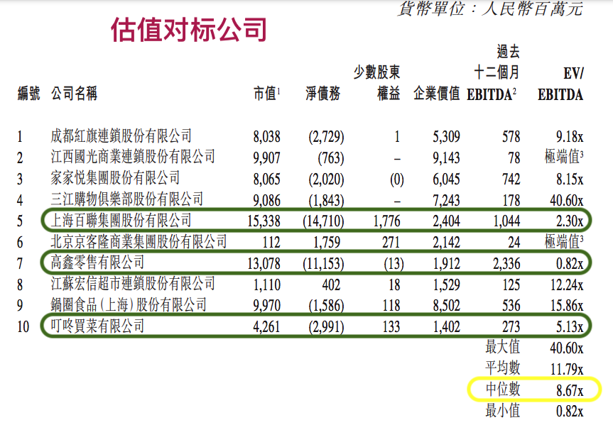 经过十年市场洗礼,现在内地市场确实也没剩下什么能直接拿来与叮咚买菜对标的独立互联网生鲜杂食配送商。估值者给出了筛选可比公司的几条标准,其中要求是在国内经营、同时具备线上线下业务的盈利性上市公司。估值者最后找了一个中位数8.67x,来推算叮咚买菜全部股权的市场公允价值,计算过程如下表: