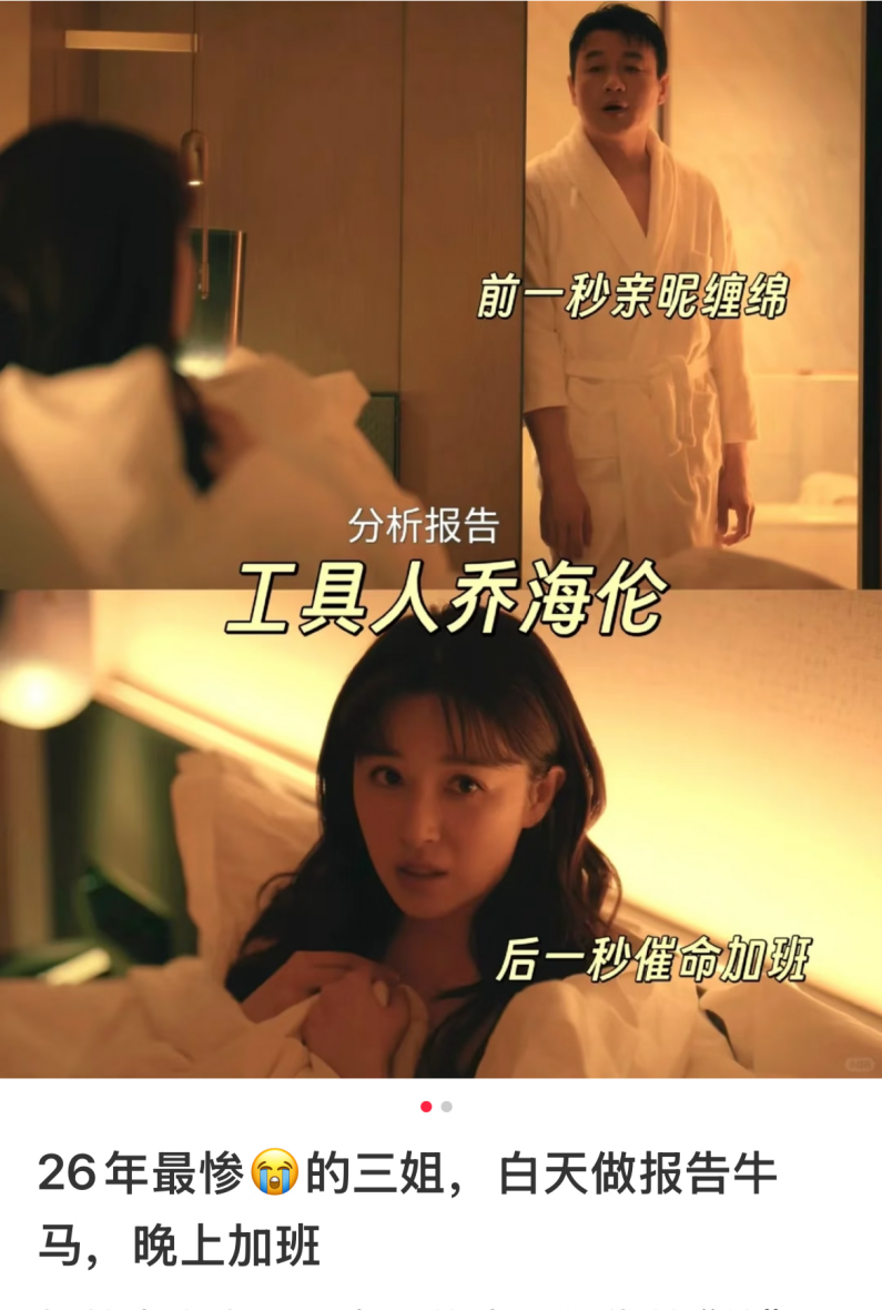 剧中最具争议的一幕是两人发生关系后,身披浴袍的李东明站在门口,语气冷硬地要求仍躺在床上的乔海伦立刻投入PPT的修改。从情人到上司的身份切换在瞬间完成,而乔海伦尚未反应过来,只能下意识用被子遮住身体,这一场景被网友讽刺为“刚卖身,就卖命”。