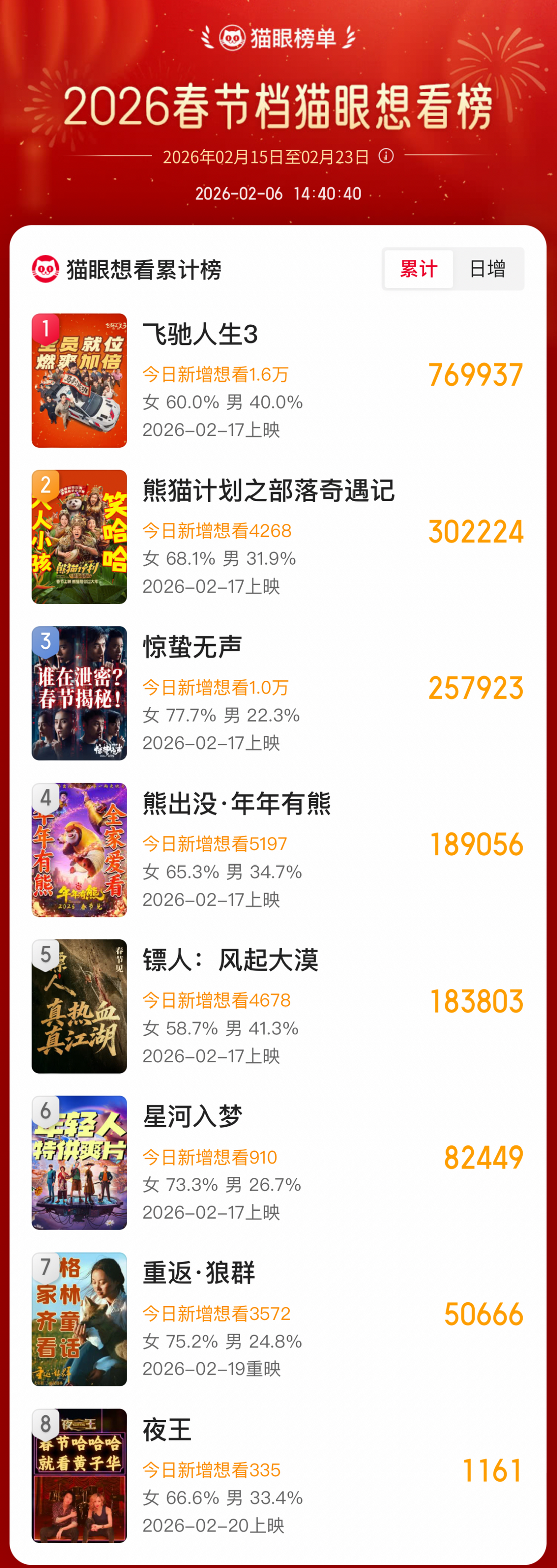 其中,《飞驰人生3》作为成熟IP,承载着稳定大盘的使命;张艺谋的《惊蛰无声》以稀缺题材和顶配阵容谋取话题制高点;《镖人:风起大漠》则试图以硬核武侠开拓被合家欢忽视的差异化市场;而《熊出没》系列与《熊猫计划》则牢牢锁住家庭观影刚需。