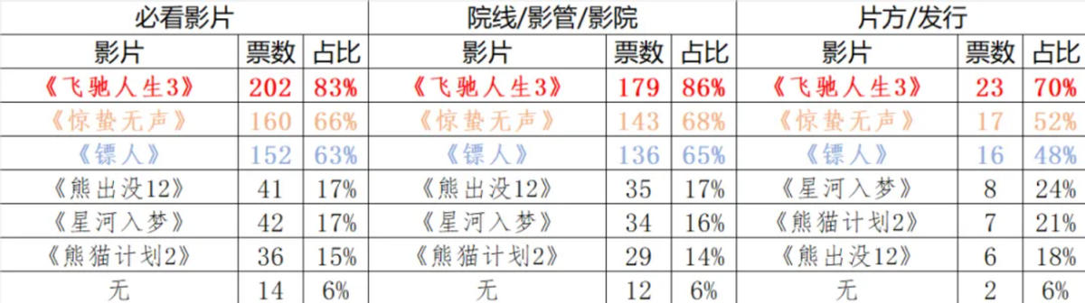 根据长三角电影市场研究中心的摸底调研报告,院线代表与片方代表在必看影片选择上整体趋势一致,均最看好《飞驰人生3》,《惊蛰无声》 与《镖人》则紧随其后。