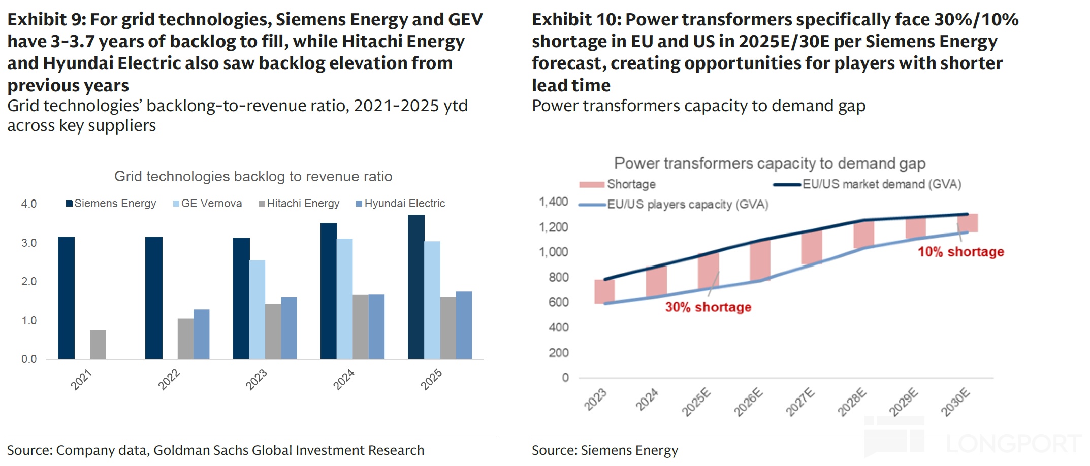 在美国,本土供应商目前仅能满足约 30% 的需求,即便包含已宣布的扩产计划,到 2027 年(预测)也仅能满足约 40%,这导致2025 年欧盟 / 美国电力变压器短缺率约 30%,关键变压器的交付周期已从过去的6-9个月暴涨至2-3年,直接封死了电网快速扩容的可能性。