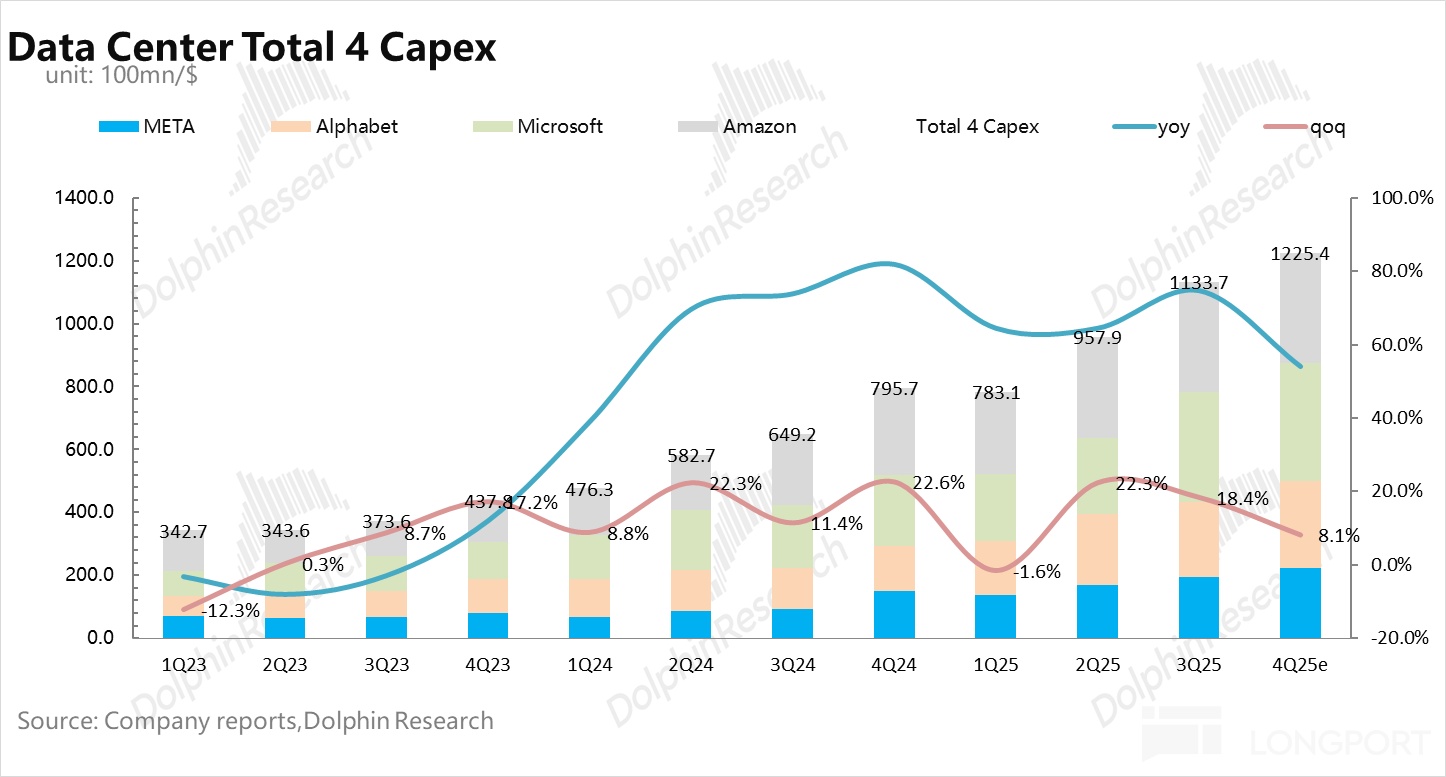 以亚马逊、微软、谷歌、Meta为代表的北美四大CSP,其资本开支自2023H2起进入“军备竞赛”模式。四家厂商的总CapEx已从2023年的约1500亿美元,飙升至2025年预计的 4060亿美元(CAGR超60%)。