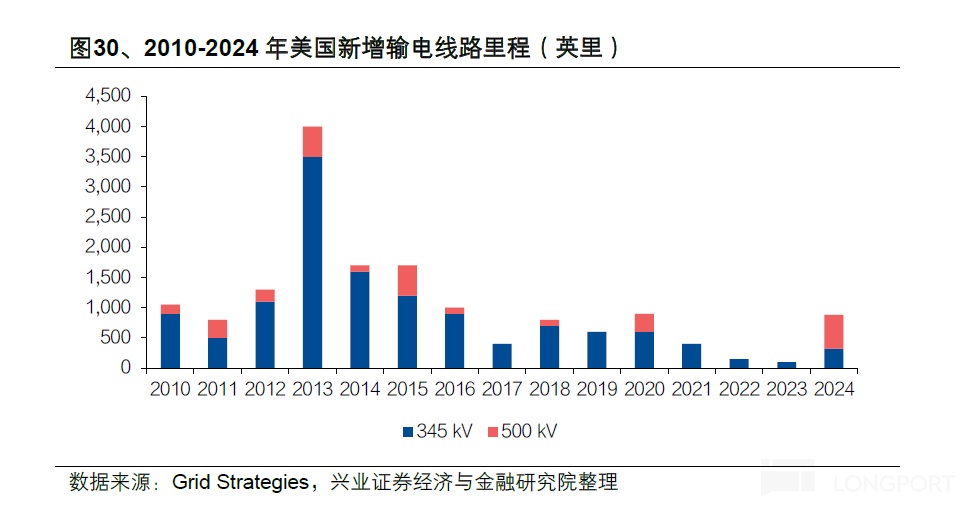 2013年后美国新增高压输电线路年里程已经大幅缩减,2024 年仅新增888 英里345KV 及以上的高压输电线路,不足美国能源部(DOE)年均规划需求5000英里的20%。