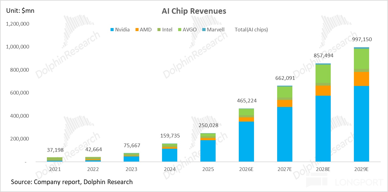 在两大阵营共振下,全球前11大科技巨头的合计资本开支将从2023年的1800亿美元,加速增长至2025年的 近5000亿美元。这种“军备竞赛”直接带动了上游AI芯片的出货量及数据中心规模的持续爆发。