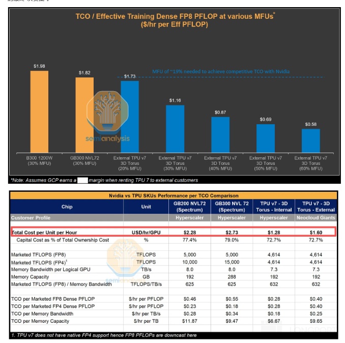 但随着Google TPU等自研芯片在推理和特定训练场景的渗透,成本将显著下降。TPU V7不仅单位算力TCO比GB300便宜41%,其在能耗和散热上的优势使其Capex有望缩减至GPU方案的一半(约275亿美元/GW)。