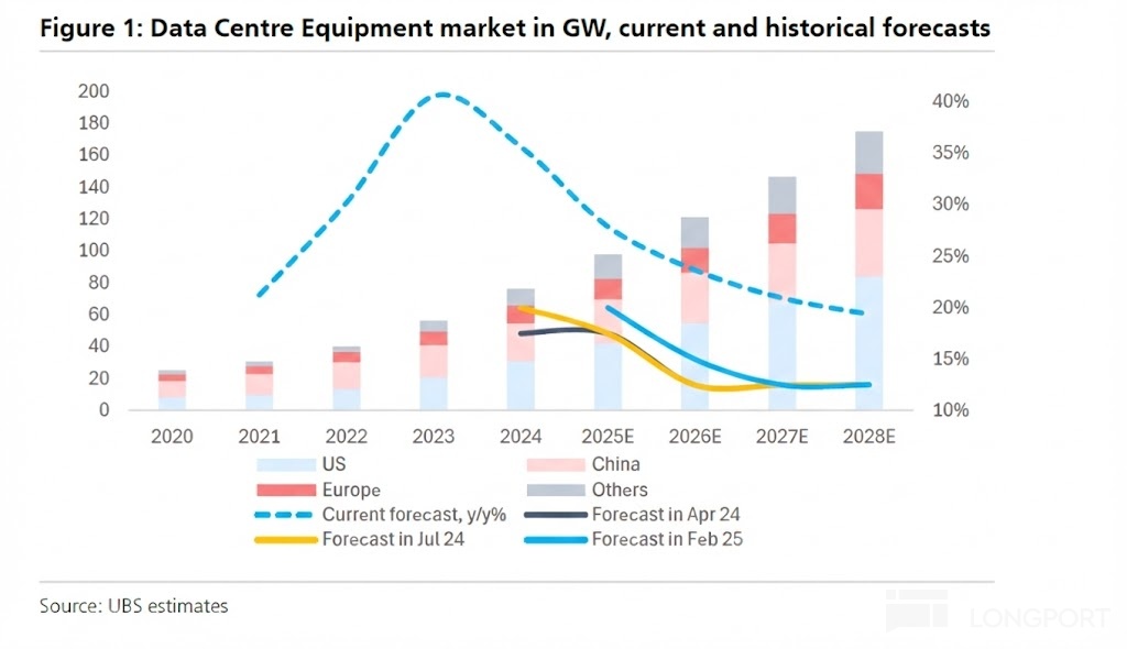 根据UBS数据,截至2025年底,全球数据中心投运容量为105 GW, 同时有25GW的在建容量,以及超过100GW处于规划阶段。