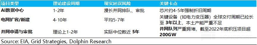 AI数据中心的理论建设之间只需要18-24各月,然而配套的输电网扩容及跨区域线路建设,受限于许可审批、环境评估及长周期设备(如变压器)的交付,往往需要 5-7 年甚至更久。