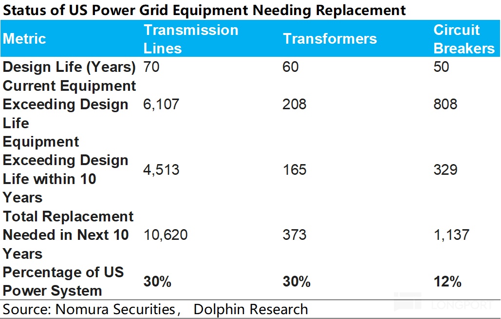 根据NERC数据显示,美国电网峰值负荷(用电负荷*用电时间=用电量),自2006年见顶后长期停滞,导致电网侧的扩容性资本开支长期缓慢(2024年才首次突破300亿美元),北美电网老化严重,平均服役时间已经接近40年。