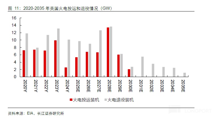 “高龄”危机: 528 GW(占比超50%)的优质基荷电源(火、水、核)服役已超 30 年,导致美国自 2010 年即进入火电退役高峰。更为严峻的是,根据EIA预测,2020-2030 年,每一年基荷机组的退役量均大于其新增量,这意味着,在AI需求爆发前夕,系统的“可靠容量”已在持续净流失。