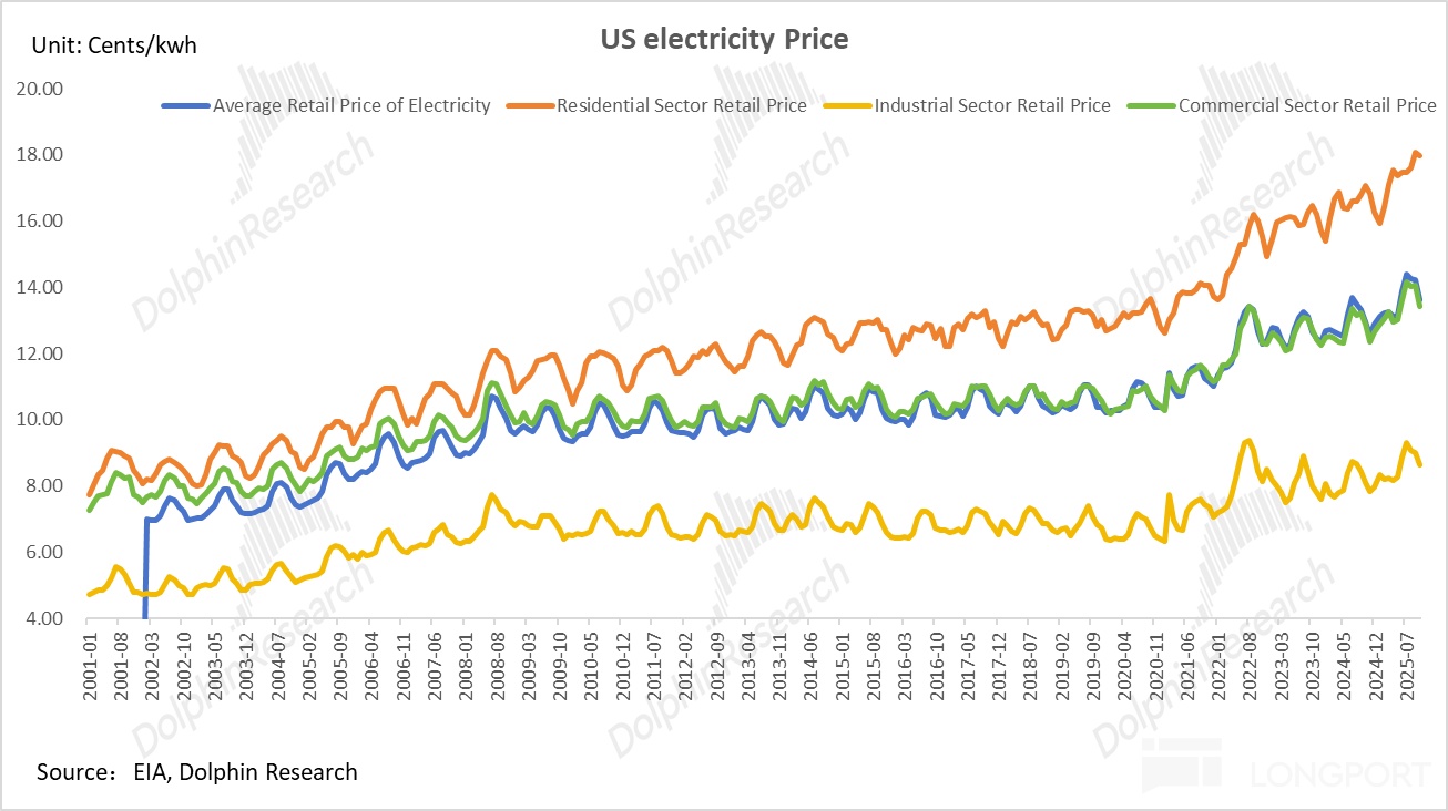 两者共振下,美国用电重回增长通道,2021-2024 年平均增速回升至 1.5% 左右,电价从 2022 年起加速上涨。
