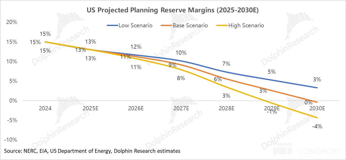 海豚君假设未来系统备用率与2024年持平(15%),结合需求端 AI 负荷的爆发,海豚君预测到2030 年,美国电力系统将出现巨大的可靠性缺口。低、中、高需求情景下的缺口规模预计将分别达到 109GW、149GW和195GW。