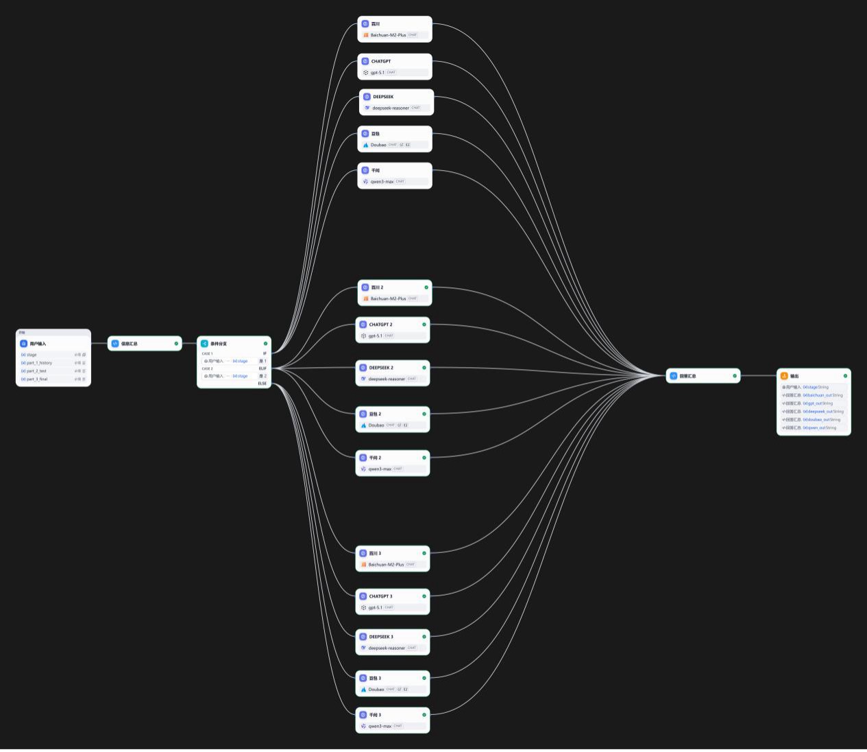 为了验证答案,我们部署了一套多智能体工作流,把这份真实病历喂给了ChatGPT、DeepSeek、豆包、千问和专注医疗的百川,进行了3个阶段累计31轮背靠背盲测。