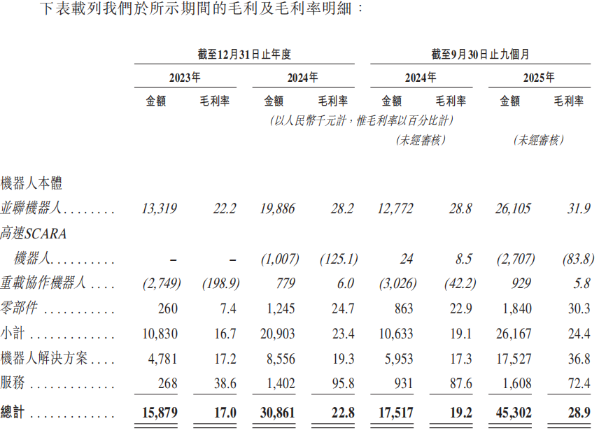 据招股书披露的2023年、2024年、2025年前三季度,阿童木联机器人的平均售价分别为8.35万元、7.55万元、6.99万元,销量分别为719台、934台、1168台;重载协作机器人的平均售价分别为15.36万元、8.27万元、5.45万元,销量分别为9台、158台、294台;高速SCARA机器人2024及2025年前三个月的平均售价分别为2.44万元、2.23万元,销量分别为33台、145台。
