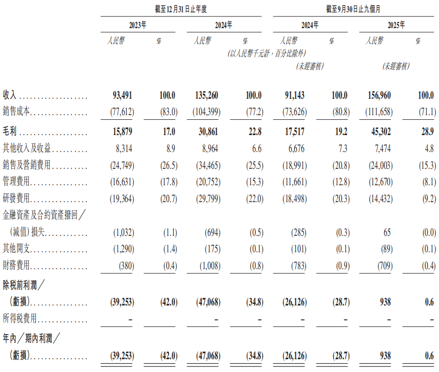 据招股书,2023年、2024年、2025年前三季度,公司营收分别为9349.1万元、1.35亿元、1.57亿元;年/期内利润分别为-3925.3万元、-4706.8万元和93.8万元。