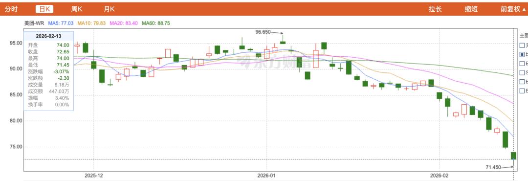 2月13日,美团每股收报72.65港元,总市值正式跌破5000亿港元大关,报4440亿港元——这是自2020年以来的最低估值水平。