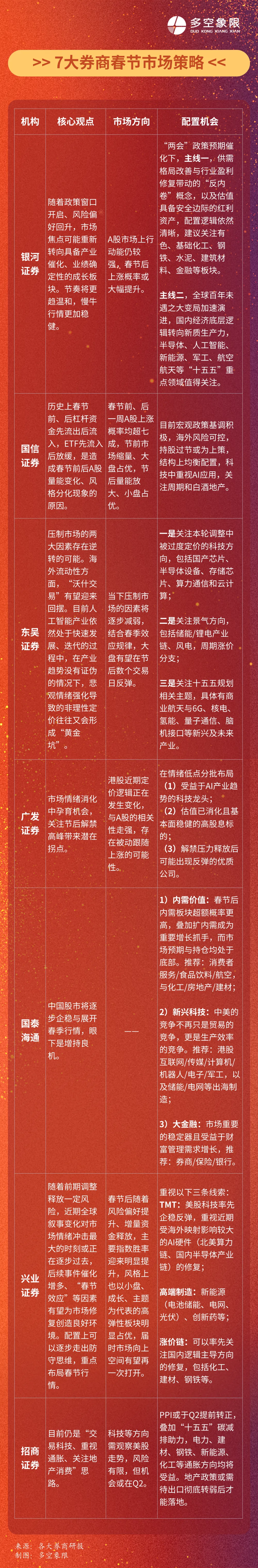 多空象限梳理近期七大券商市场观点,围绕春节效应、政策红利、资金流向等市场关切要点,总结各大机构的核心观点、市场方向及配置机会。
