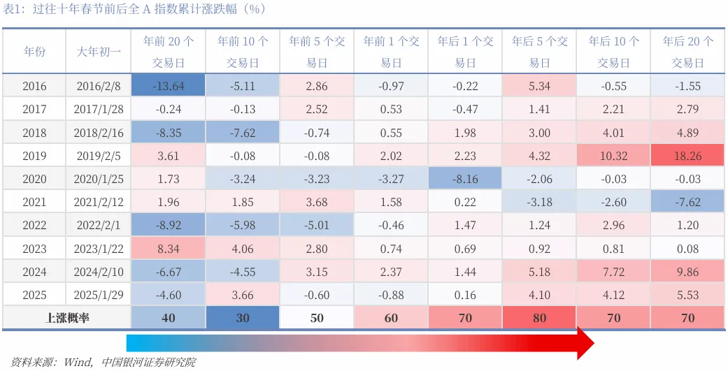A股市场存在显著的春节“日历效应”,中国银河证券梳理2016年至2025年十年间历史规律看,据统计,全A指数春节后1个交易日上涨的概率是70%,节后5个交易日上涨的概率是80%。