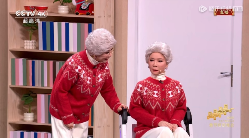 直到蔡明从屋子里推出坐在轮椅上的“蔡明”,两个蔡明同框时,大家才恍然大悟,原来第一次出场的奶奶竟然是个机器人,正是松延动力的仿生机器人。