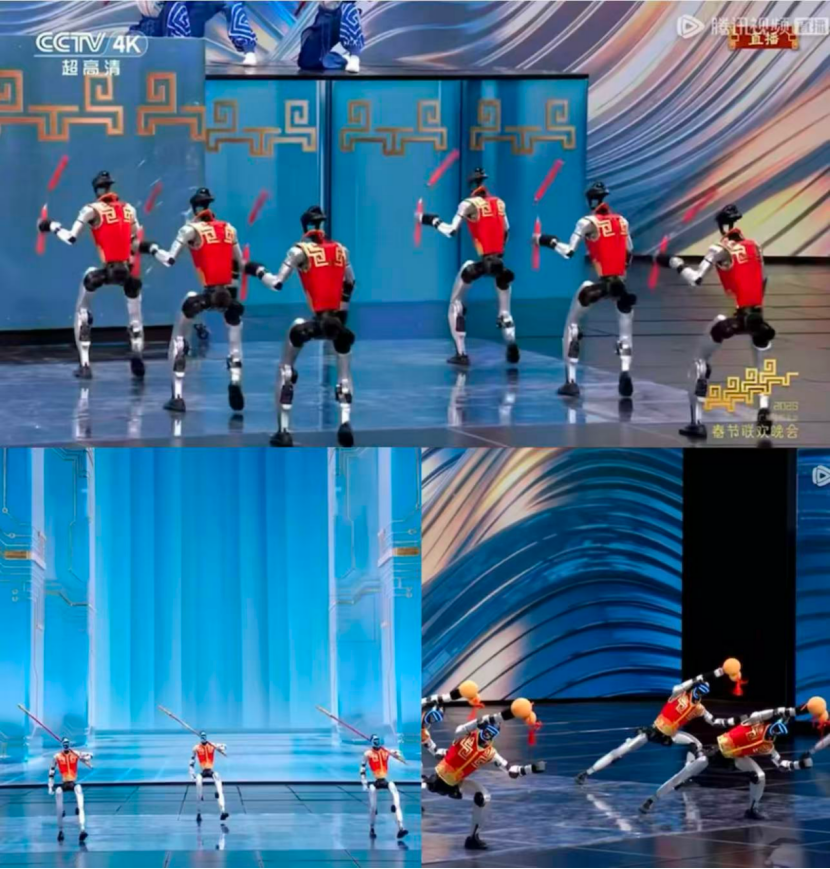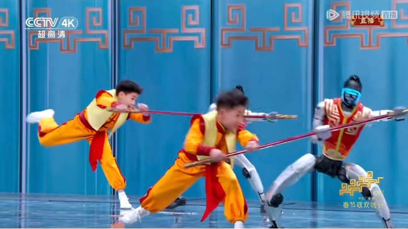 相比一年前“被人搀扶上台、颤颤巍巍扭秧歌”的亮相,这一次,它们不仅能跳能打,还会讲笑话,舞剑、与人类比武,动作更花哨,和人类的互动也更为自然,甚至出现了傻傻分不清楚的仿生机器人“蔡明”。