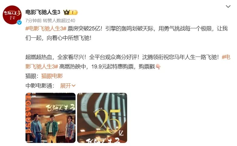 凭借精彩的赛车场面和和真实接地气的父子情感线,《飞驰人生3》确实获得了出圈的讨论度。然而,没有人相信《飞驰人生3》的总票房能达到《哪吒2》的水平。要知道,去年《哪吒2》面对众多竞争对手,仍然能在《封神2》《唐探1900》等IP热门续作的围攻下实现连续多天的票房逆袭。灯塔数据显示,去年上映7天后,《哪吒2》的票房已经突破40亿元,远高于今年同期《飞驰人生3》的25亿元。