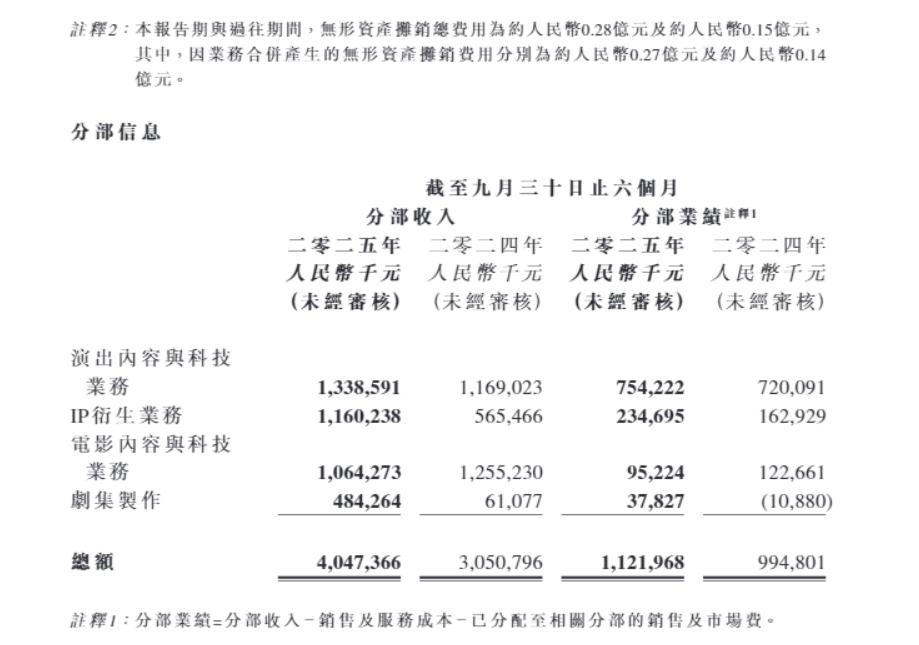 2025年3月至9月,大麦娱乐演出内容与科技业务、IP衍生业务、电影内容与科技业务、剧集制作收入分别为13.4亿、11.6亿、10.6亿和0.5亿元。从财报来看,大麦娱乐最主要的收入来源并非电影,而是演出售票与IP衍生业务。