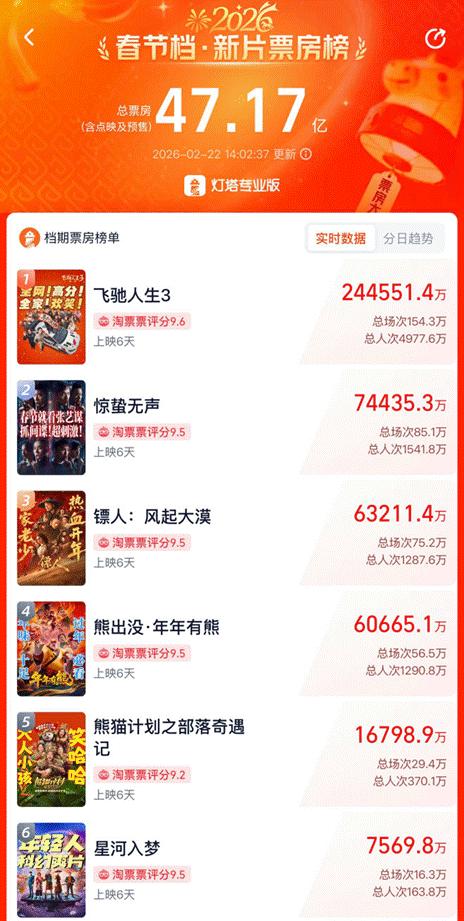 此次春节档横跨9天,为“史上最长春节档”;截至2月22日下午,春节档总票房(含预售)已超47亿元;《飞驰人生3》《惊蛰无声》《镖人:风起大漠》占据票房前三位。今年春节档,谁是最大赢家?