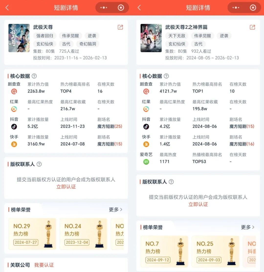 据DataEye-ADX行业版数据,《武极天尊》第一部最高红果收藏216.7万,抖音端原生累计播放量5.2亿,单集点赞82万;其第二部《武极天尊2之神界篇》最高红果收藏195.8万,抖音端原生累计播放量4.2亿,快手端原生累计播放量达1.4亿,多次霸榜DataEye短剧热力榜TOP1,进一步沉淀了IP口碑与粉丝群体。