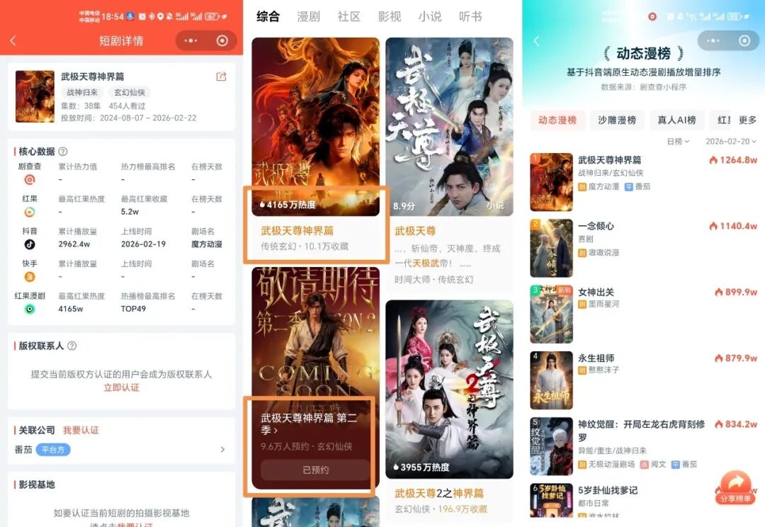 从红果春节档追剧片单来看,假期日均上线1部精品漫剧,其中魔方出品、真人短剧IP改编的3D漫剧《武极天尊神界篇》,以超高预约量成为春节前最受期待漫剧。