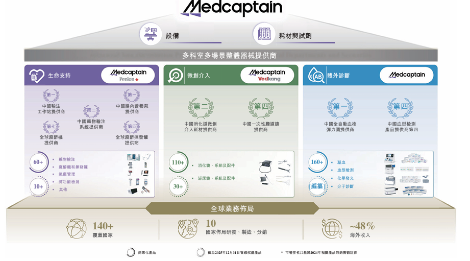 截至2025年底,公司商业化产品达330种,包括60种生命支持产品、110种微创介入产品及160种体外诊断产品,覆盖全球逾140个国家及地区,海外收入占比达48%;在国内,产品累计覆盖超6000家医院,其中约90%为三级甲等医院,同时仍有40余个管线候选产品在推进中。