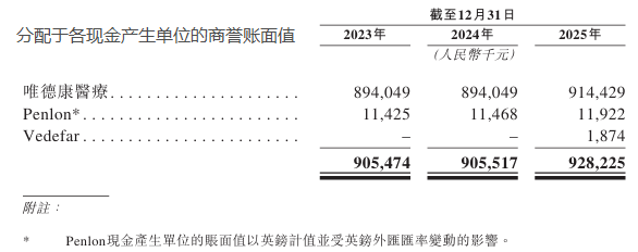 首当其冲的是高企的商誉风险,截至2025年底,公司因收购因收购英国Penlon、江苏唯德康医疗、Vedefar等企业形成的商誉高达9.28亿元,占同期净资产18.76亿元的49.47%,近乎半壁江山。其中,仅收购唯德康医疗一项就形成9.14亿元商誉,成为商誉总额的绝对主力。