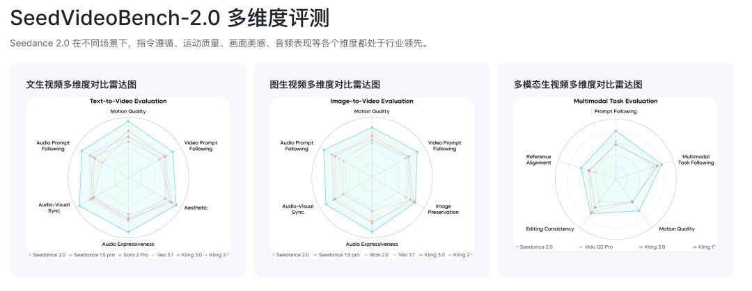 Seedance 2.0 在指令遵循、运动质量、画面美感、音频表现等各个维度都处于行业领先地位