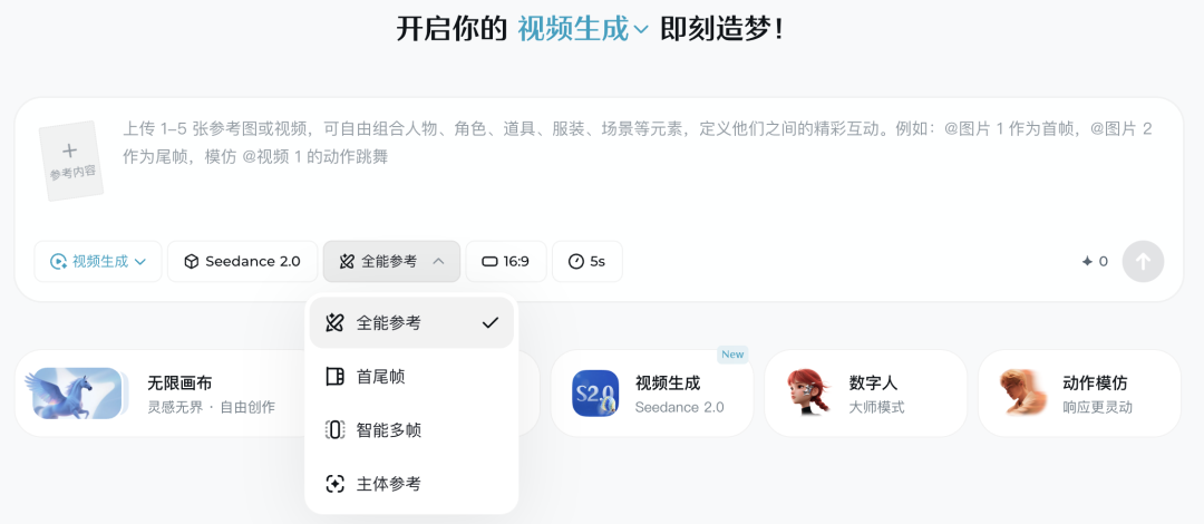 例如,“让@Image1中的角色跳@Video1中的舞蹈”,这种结构化的指令远比冗长的自然语言描述更高效、更无歧义。