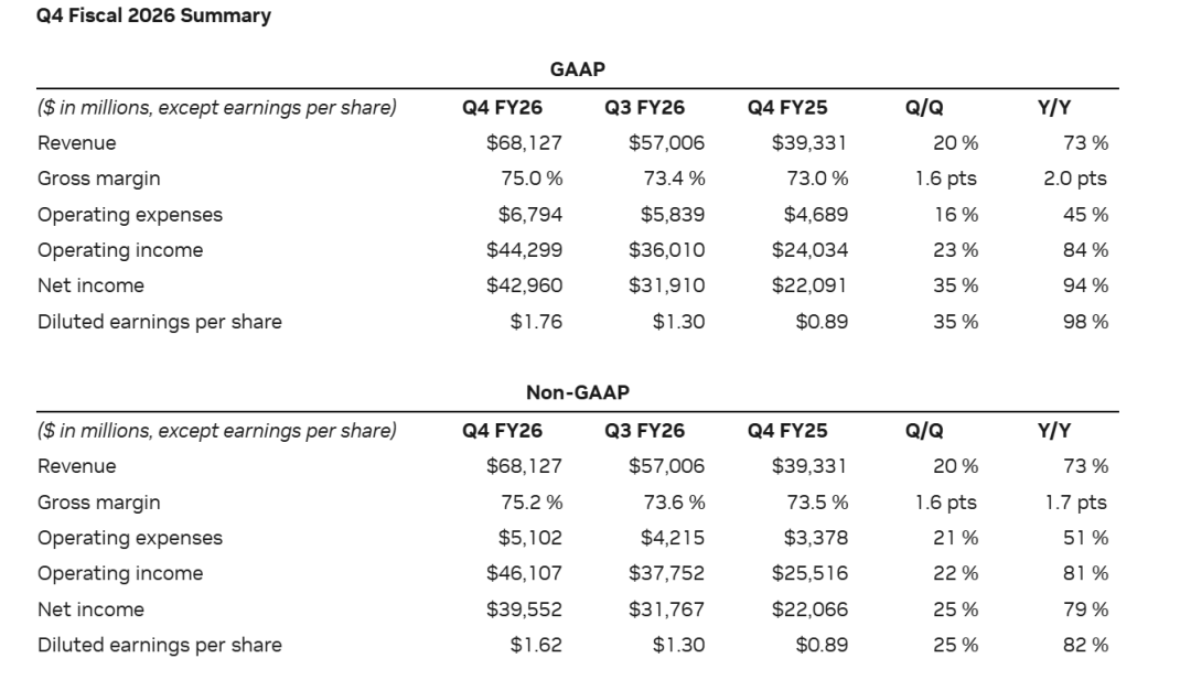 2026财年第四季度营收681亿美元,同比增长73%,创历史新高;GAAP净利润429.6亿美元,同比增长94%;毛利率75%,同比增长2个百分点。