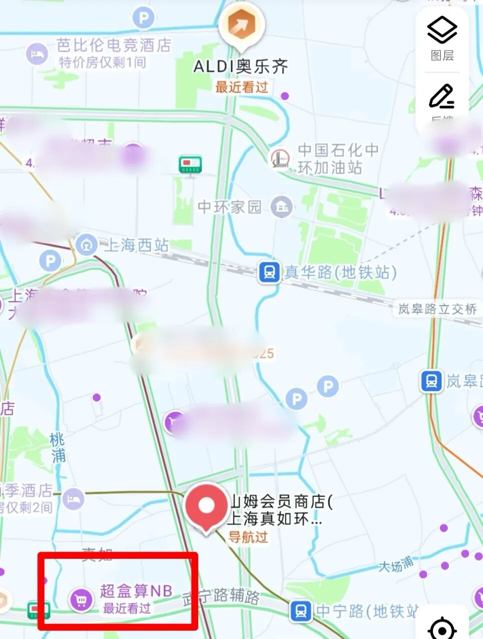 在靠近上海内环高架的真如,从地铁站出来只需走数十米,就能来到位于真如环宇城的山姆会员商店,这也是唯一一家开在上海城区的山姆店。同时,在这家山姆店北面约两公里,就开着一家奥乐齐;再从山姆店向西走700多米,还有一家盒马旗下的超盒算NB。