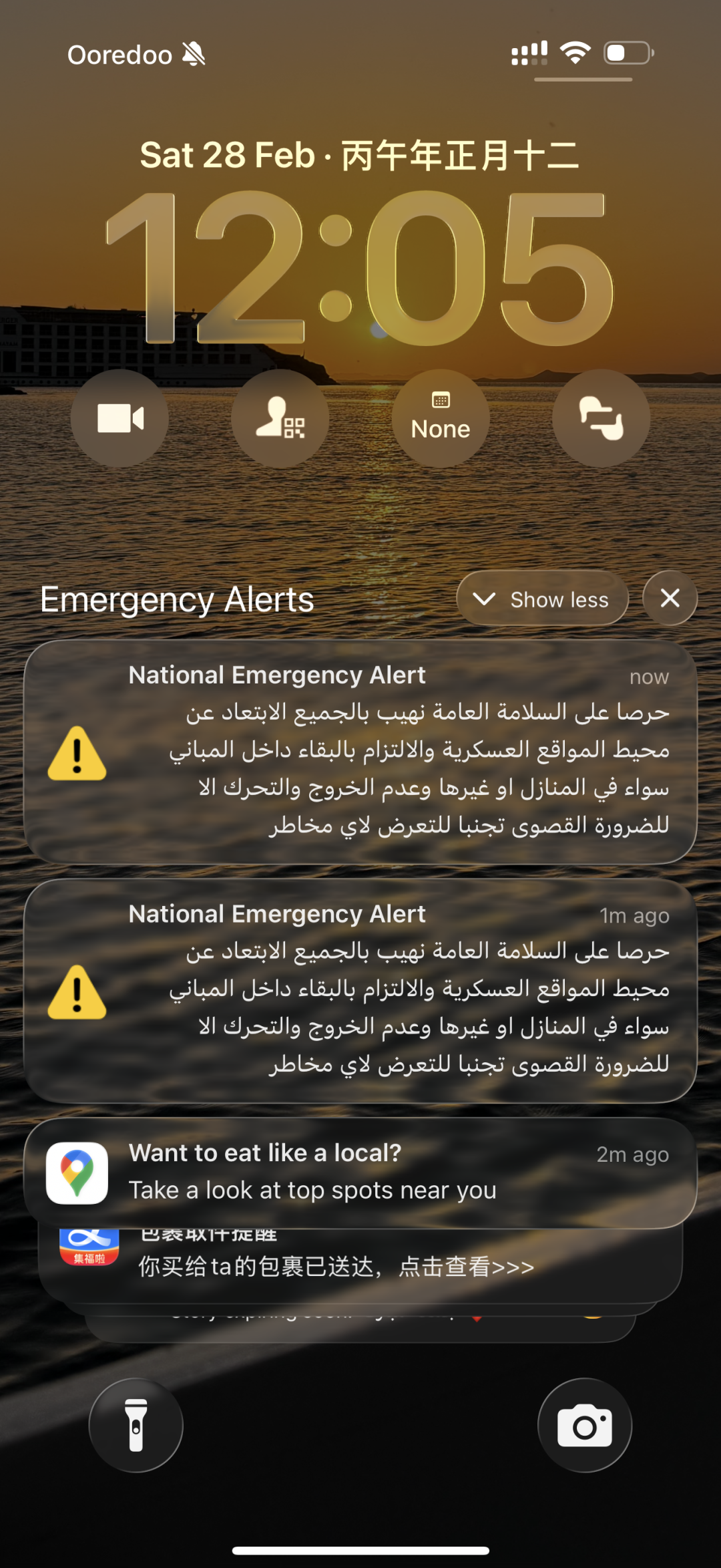 现在海湾国家里沙特是最安全的,毕竟国土大,卡塔尔反而更危险,巴林因为太小,当地的人都亲眼看到冲突情况了。今天多哈这边所有手机都收到了防空警报,一开始发的警报没配英文根本看不懂,后面才补上了英文版本,我还拍到了卡塔尔导弹被拦截的实况动图,卡塔尔国防部说拦截了三枚伊朗导弹,还有些命中了目标。