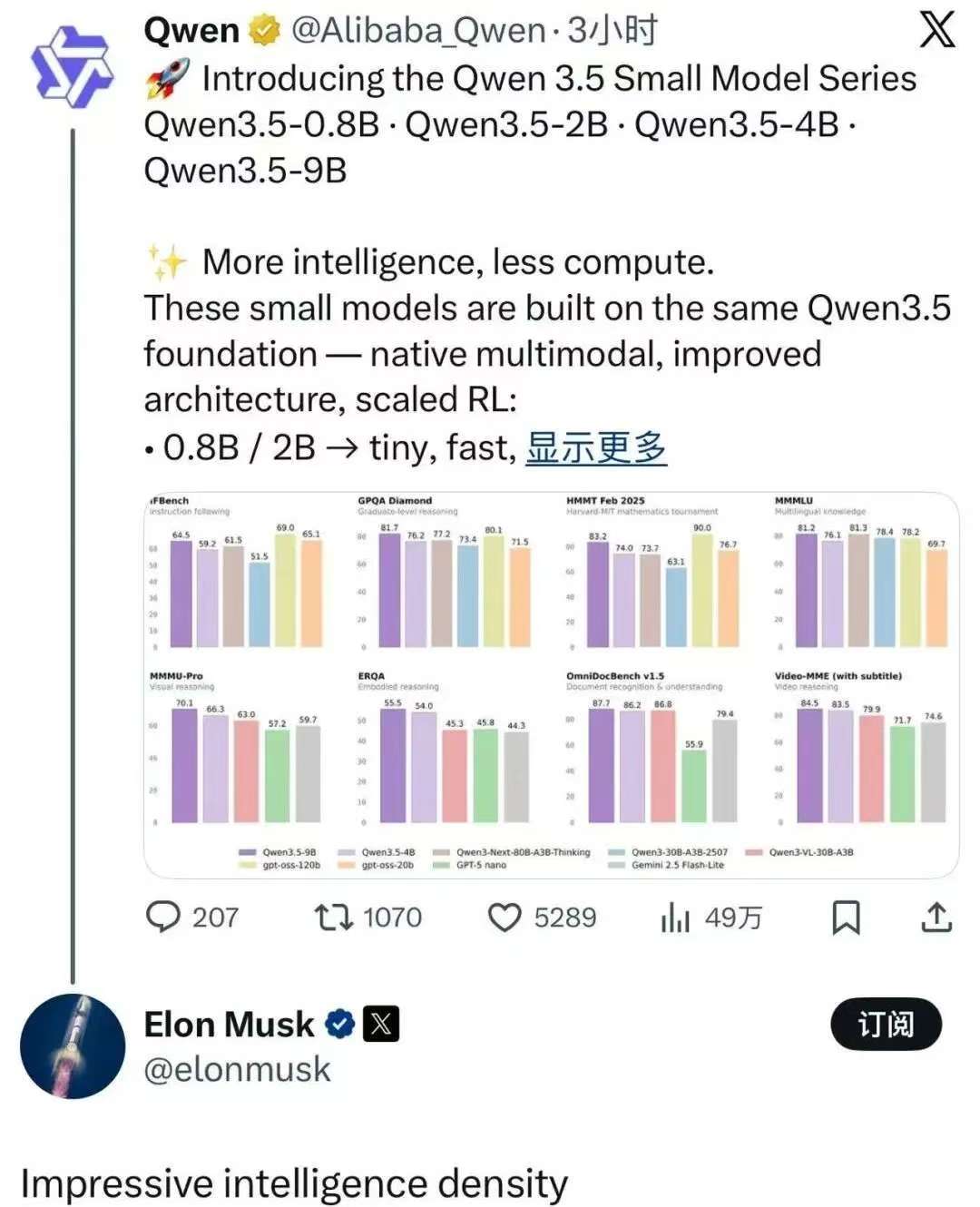 ▲阿里近来低调开源了4款Qwen3.5系列模型,引来马斯克前排围观。
