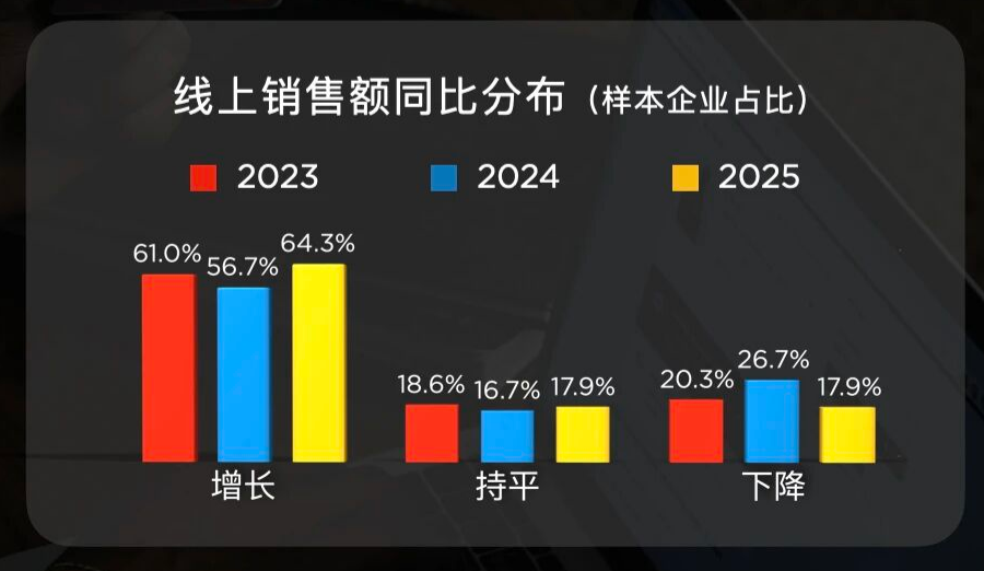 2025年,线上销售额实现同比增长的企业占比达64.3%,其中,增速超过10%的企业占比高达46.4%,远高于2024年的26.7%。这不是补充性的渠道增长,而是行业的结构性转变。