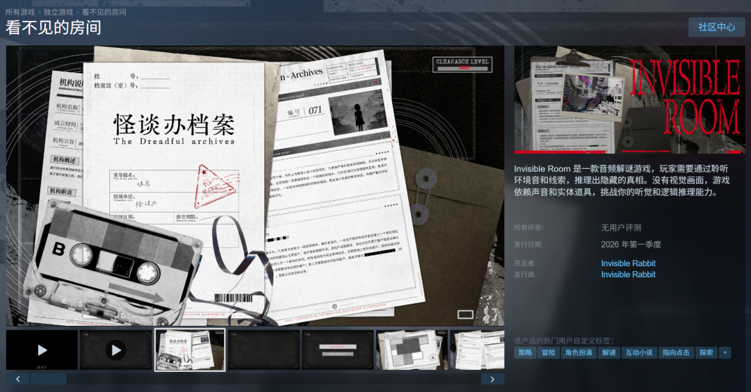 我在去年机核“摊开玩”展会的现场体验到了这款游戏的demo。落座后,王亚晖首先向我手中塞了一支笔和一个文件夹,里面是打引好的档案和房间布局图。带着几分意外,我望向屏幕,只浮现出了简单的UI——这是一个完全靠听觉推进的游戏,游戏画面上没有任何视觉信息,你在黑暗的房间里移动,通过耳朵捕捉周遭的信息,在手中的布局图上留下笔记,摸清自己身处何地,然后寻找推进剧情的方式。体验上有一些像一个推理性很强的剧本杀。