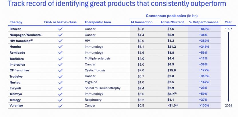 能取得如此战绩,绝非运气。Royalty Pharma 拥有一套极其严苛的筛选标准:只挑已获关键临床数据验证、解决重大未满足临床需求、竞争格局清晰、增长空间明确的产品。在极致筛选下,仅有“2%” 的初始项目能最终落地。