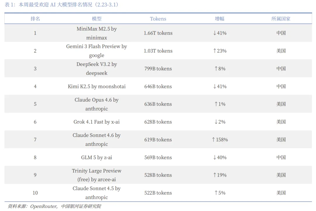 截至2026年2月28日,该平台内前十模型总Token消耗量已突破28.7万亿,其中,国产模型贡献超过14.69万亿,为历史上首次单月Token调用占比过半,且超越了美国模型。