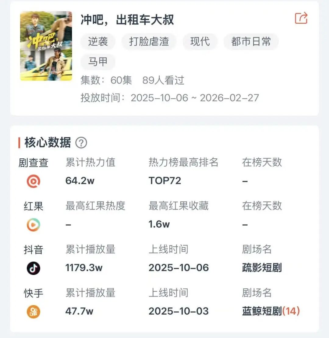 就拿重庆某区文旅花300多万拍的短剧《冲吧,出租车大叔》来说,同样是以“车辆驾驶、街头竞速、动作场面”为强情节驱动,洪崖洞、解放碑、蜿蜒曲折的道路这些充满“渝”味的代表物一个也没少,最终热度平平,端原生播放量1000万左右,热力值64W,红果收藏仅1.6万,按热度来说成本应该是很难收回来。