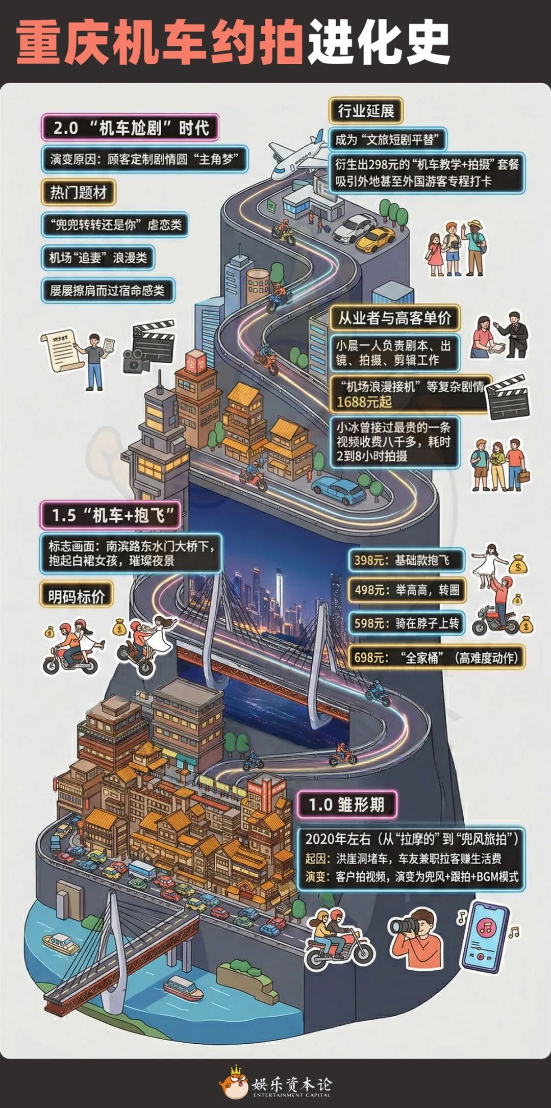 最初的玩法很简单:骑手载着乘客在重庆的夜景里兜风,摄影师在后面跟拍,出一段酷炫的骑行视频,再配上当时流行的BGM。但重庆的夜景实在太能打了,随便一帧就是壁纸,加上社交媒体对流量的渴求,这套“流水线”很快被复制、迭代、升级。