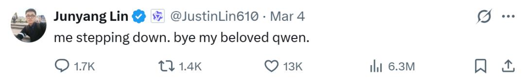 3月4日凌晨,林俊旸在 X 上发布“me stepping down. bye my beloved qwen”,那时他是否会想到如此之大的舆论震动,我们不得而知。