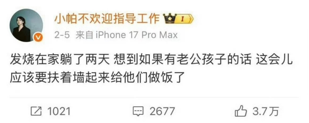 举个例子,闫学晶在直播中说自己儿子穷、小帕在春节前发“如果结婚生病了要给老公做饭”就属于典型的语境坍塌。前者在她所属的圈子里确实算得上穷,后者类似的调侃在脱口秀圈里看起来也并无不妥,可她们一个在面向大众(直播受众往往更下沉一些)时抱怨自己孩子年收入是20-30万,一个在典型合家欢时间段提及男女对立问题,自然引来不可收拾的后果。