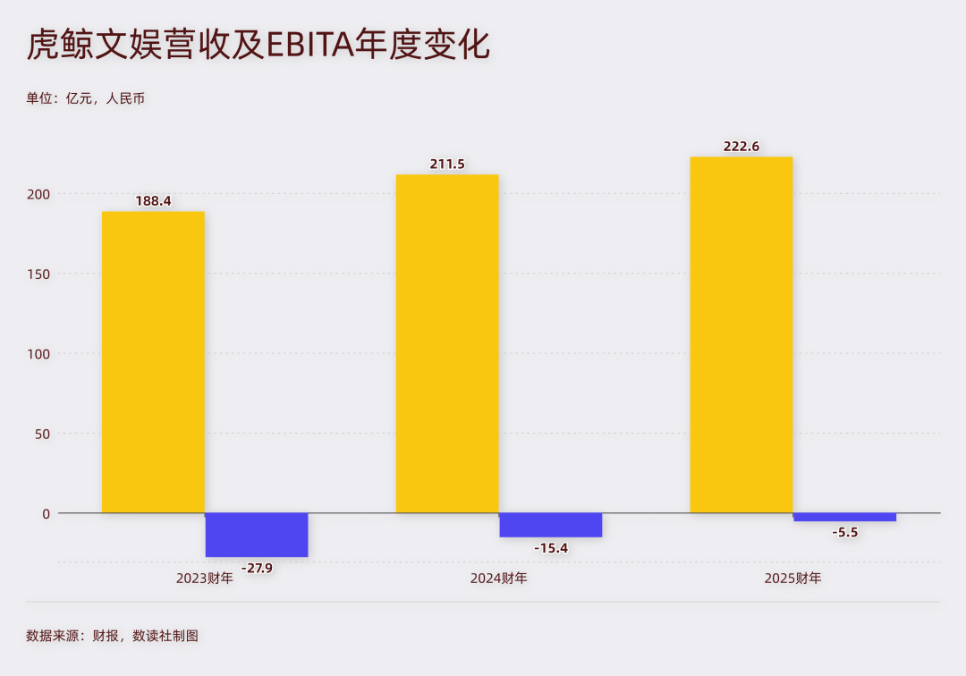 2025财年(截至2025年3月31日),虎鲸文娱营收同比增长5%至222.67亿元,调整后EBITA虽较去年同期收窄64%,但仍亏损5.54亿元。