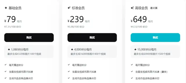 可灵的会员是60块钱一个月,送1800积分。生成一段15秒视频,消耗180积分,也就是一个月大约10个视频。